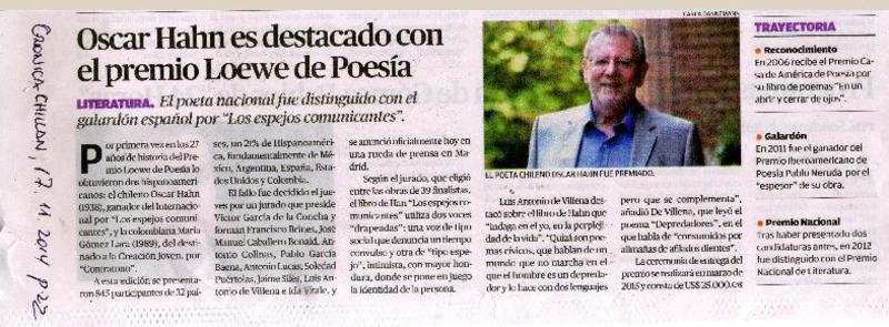 Oscar Hahn recibe el premio Pablo Neruda, su mayor galardón en Chile [artículo] Roberto Careaga C.