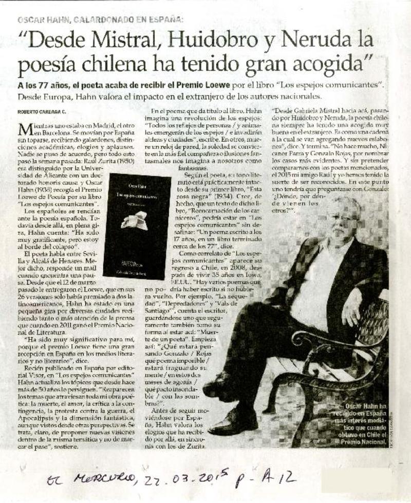 "Desde Mistral, Huidobro y Neruda la poesía chilena ha tenido gran acogida" [artículo] Roberto Carega C.