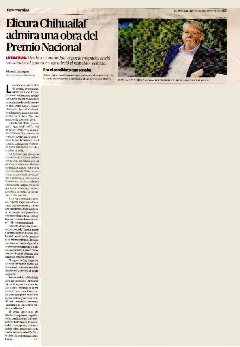 Elicura Chihuailafadmira una obra del premio nacional [artículo] Eduardo Henríquez.
