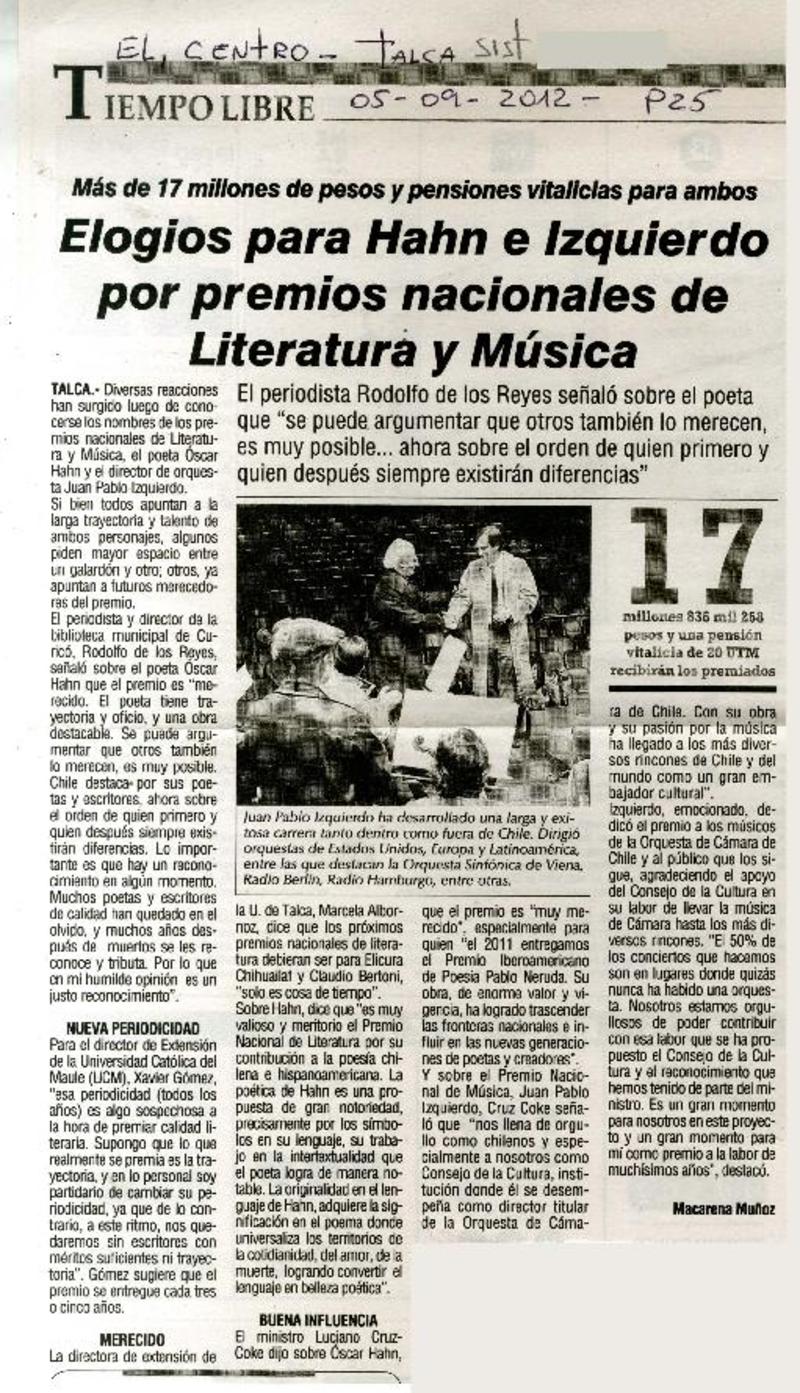 Elogios para Hahn e Izquierdo por premios nacionales de literatura y música [artículo] Macarena Muñoz.