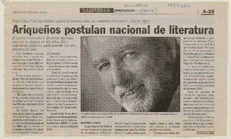 Ariqueños postulas nacional de literatura [artículo] Francisco Aedo.