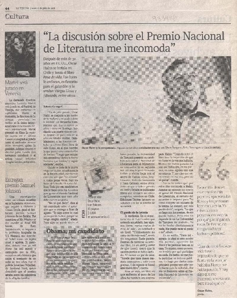 Poeta Óscar Hahn gana premio nacional de literatura. [artículo]
