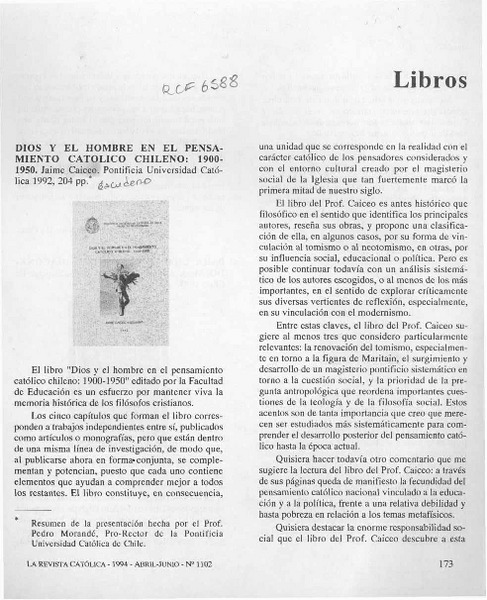 "Dios y el hombre en el pensamiento católico chileno, 1900-1950" [artículo] Pedro Morandé.