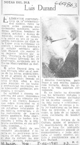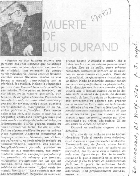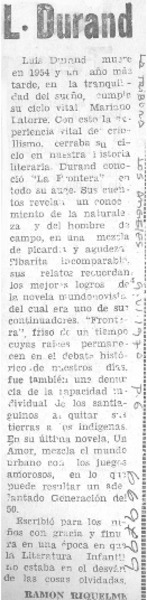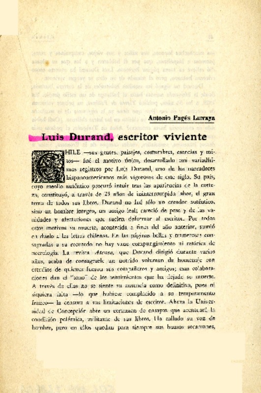 Luis Durand, escritor viviente [artículo] Antonio Pagés Larraya.