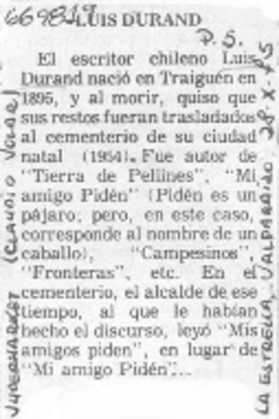 El escritor Luis Durand [artículo] Marino Muñoz Lagos
