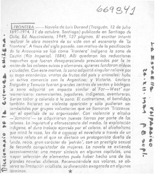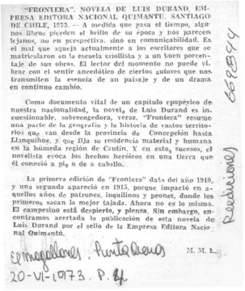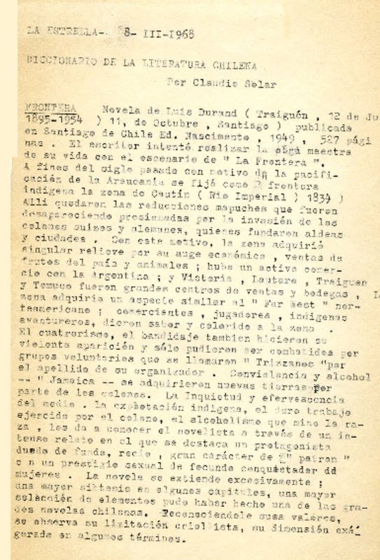 Frontera", por Luis Durand [artículo] Olga Acevedo.