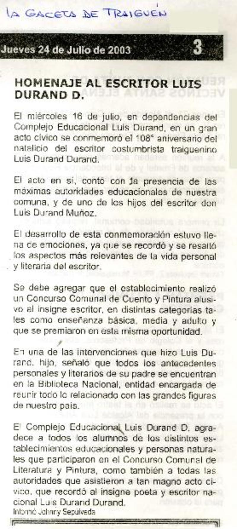 Homenaje al escritor Luis Durand D. [artículo] Johnny Sepúlveda.