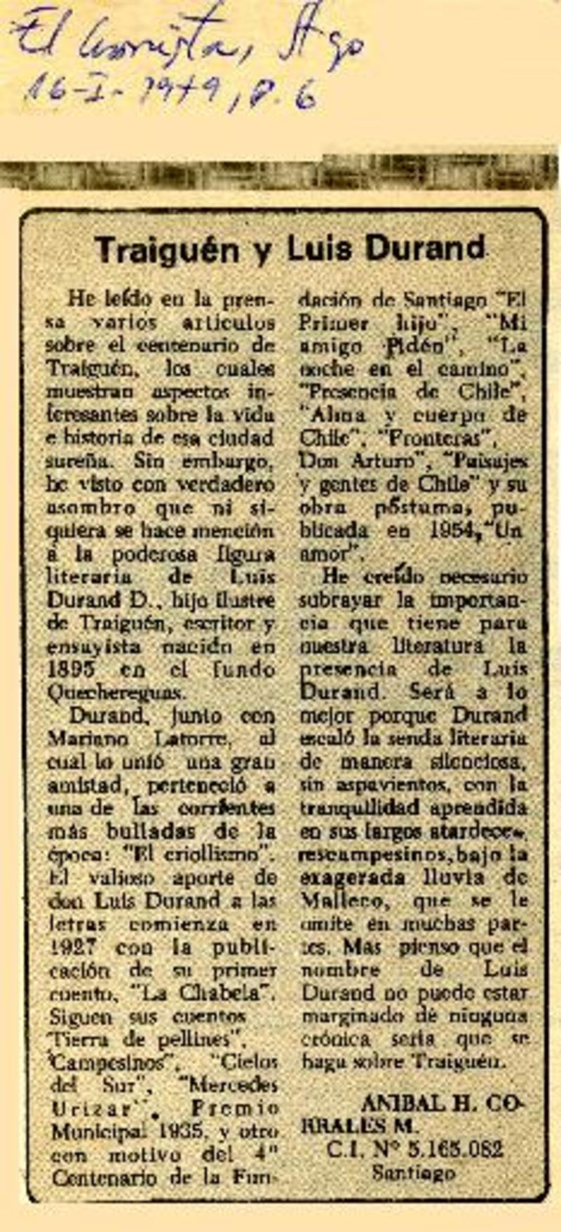 Traiguenino insigne: escritor Luis Durand [artículo]