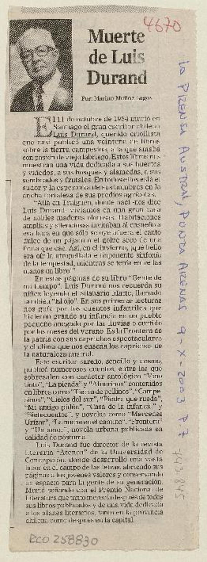 Muerte de Luis Durand [artículo] Marino Muñoz Lagos.