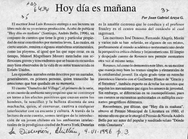Hoy día es mañana [artículo] Juan Gabriel Araya G.