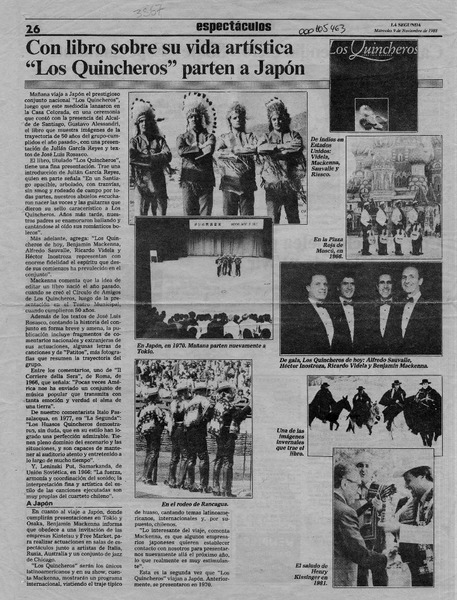 Con libro sobre su vida artística "Los Quincheros" parten a Japón [artículo].