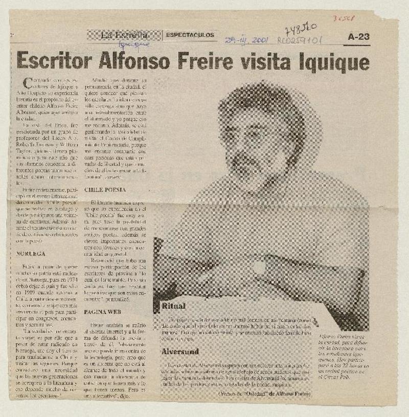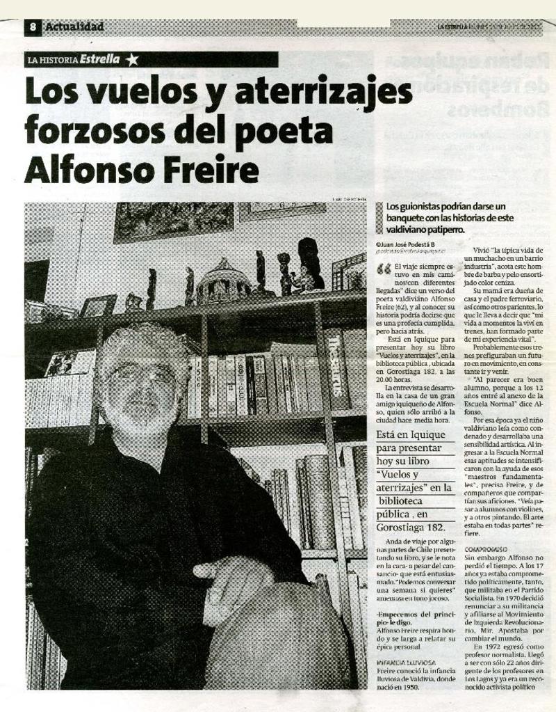 Escritor Alfonso Freire visita Iquique. [artículo]
