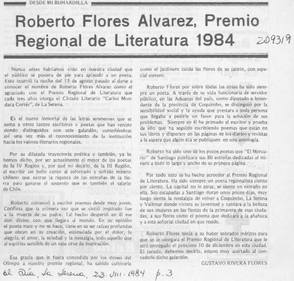 Roberto Flores Alvarez, Premio Regional de Literatura 1984 [artículo] Gustavo Rivera Flores.