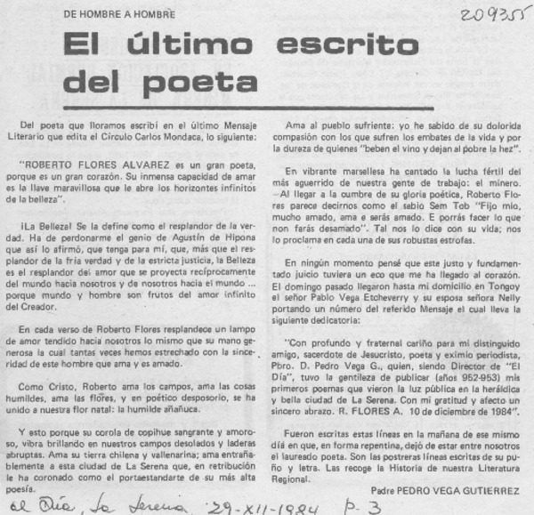 El último escrito del poeta [artículo] Pedro Vega Gutiérrez.