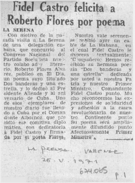 Fidel Castro felicita a Roberto Flores por poema. [artículo]