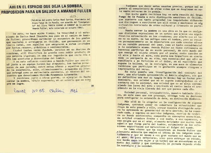 Ahí en el espacio que deja la sombra, proposición para un saludo a Amanda Fuller [artículo] Carlos René Correa.