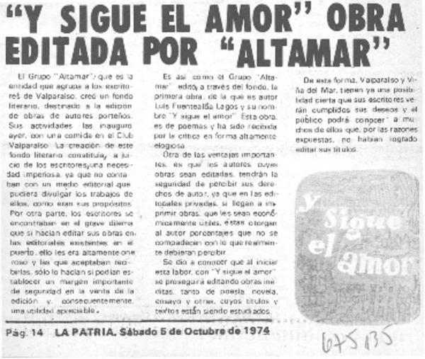 "Y sigue el amor" obra editada por "Altamar" [artículo]