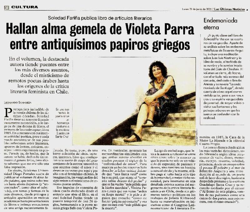 Hallan alma gemela de Violera Parra entre antiquísimos papiros griegos [artículo] Leonardo Sanhueza.