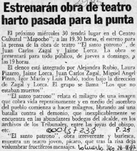 Estrenarán obra de teatro harto pasada para la punta [artículo].