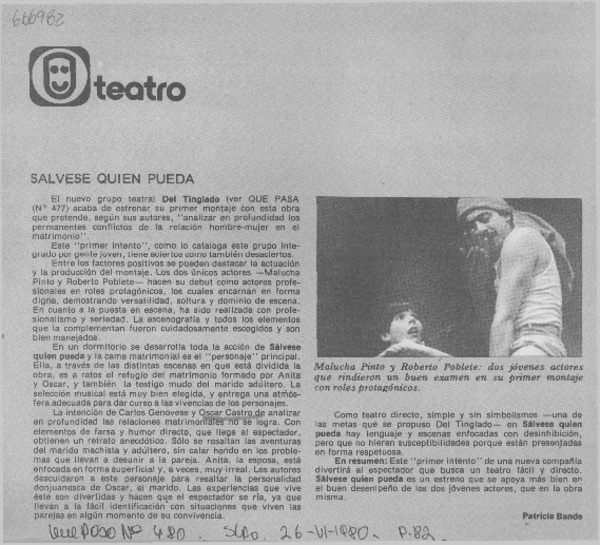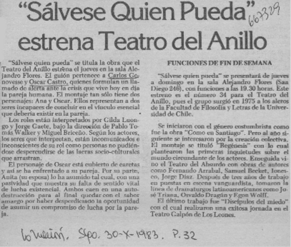 Sálvese quien pueda" estrena Teatro del Anillo. [artículo]