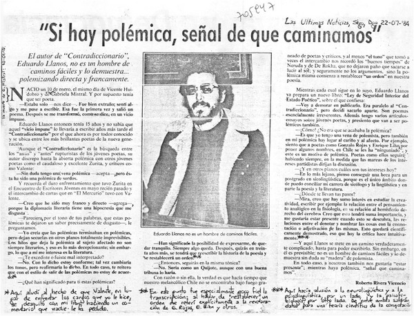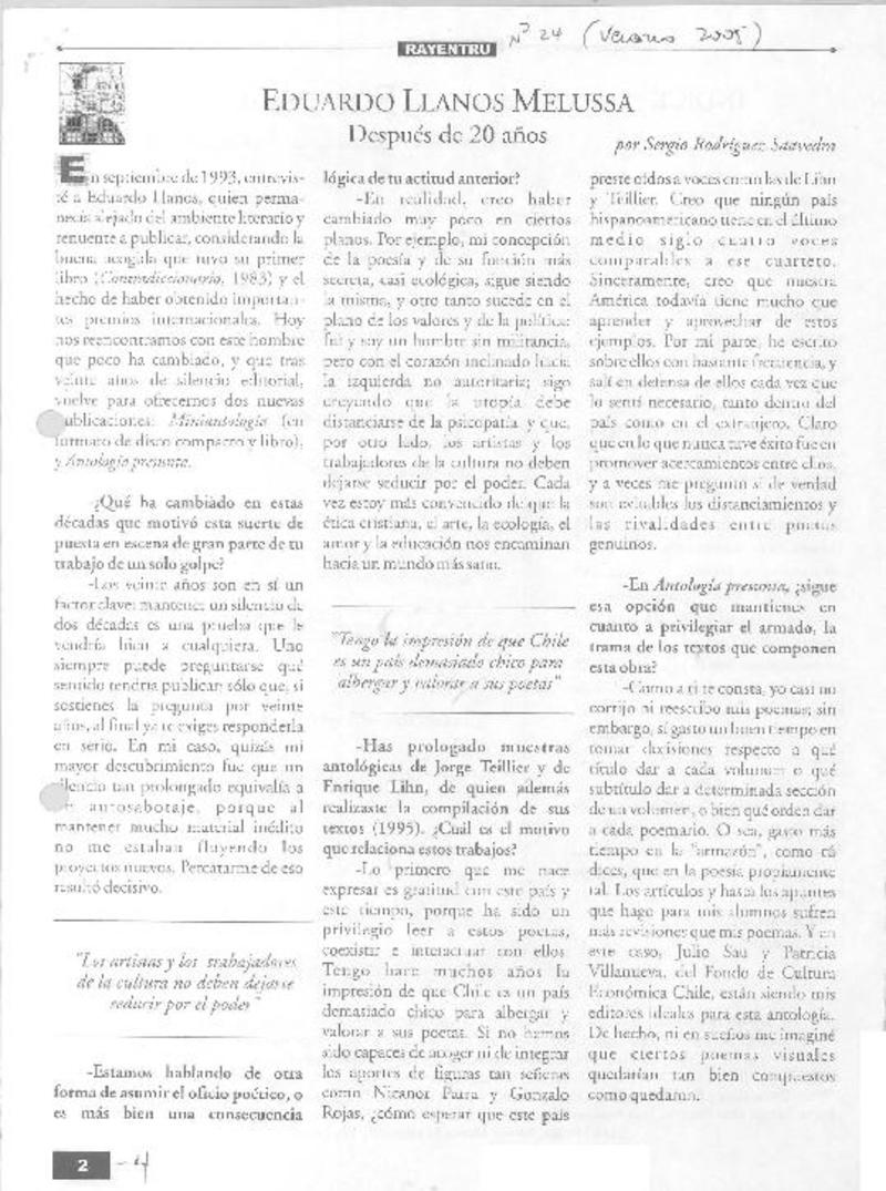 Eduardo Llanos Melussa después de 20 años (entrevista) [artículo] Sergio Rodríguez Saavedra.