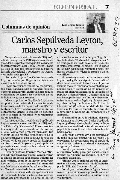 Carlos Sepúlveda Leyton, maestro y escritor [artículo] Luis Godoy Gómez