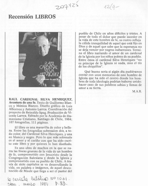 Raúl Cardenal Silva Henríquez, aventura de una fe [artículo] M. A. R.