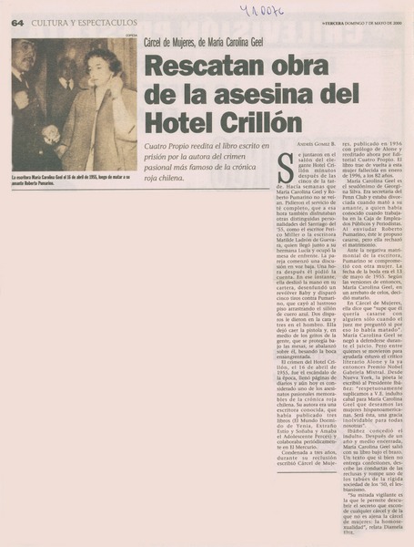 Rescatan obra de la asesina del Hotel Crillón [artículo] Andrés Gómez B.