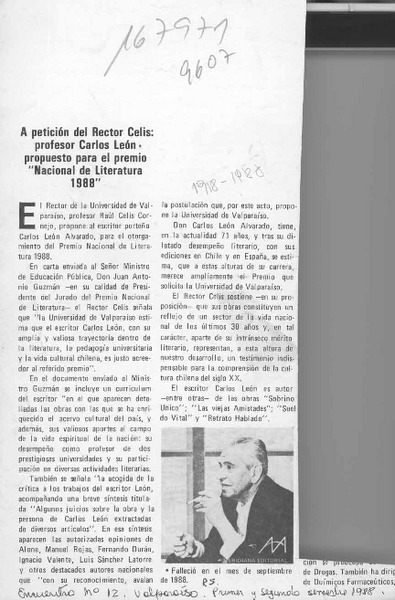 A petición del Rector Celis, profesor Carlos León propuesto para el premio "Nacional de Literatura 1988" [artículo].