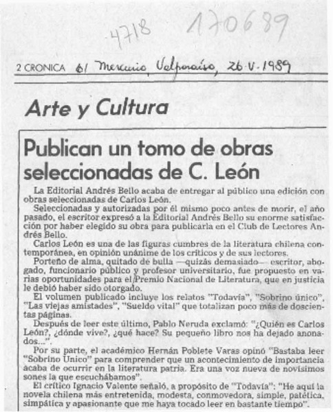 Publican un tomo de obras seleccionadas de C. León [artículo].
