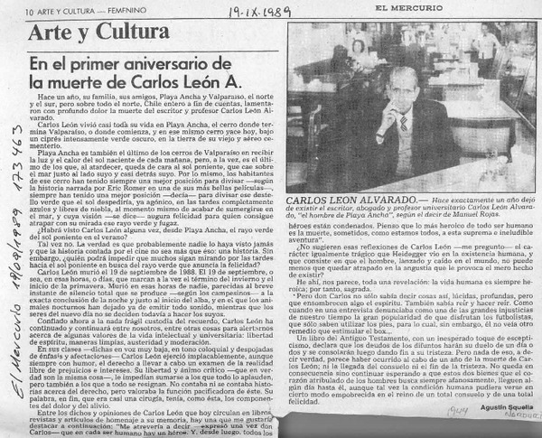 En el primer aniversario de la muerte de Carlos León A. [artículo] Agustín Squella.