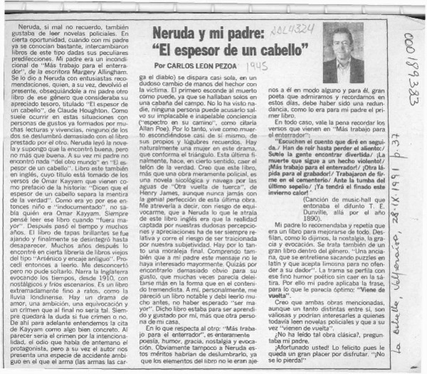 Neruda y mi padre, "El espesor de un cabello" [artículo] Carlos León Pezoa.