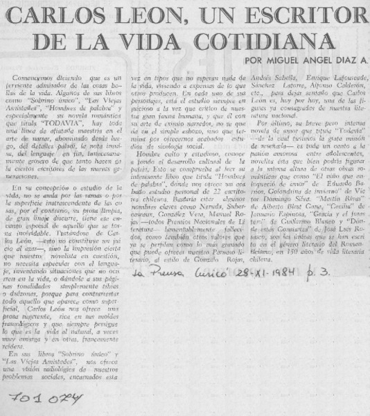 Carlos León, un escritor de la vida cotidiana [artículo] Miguel Angel Díaz A.