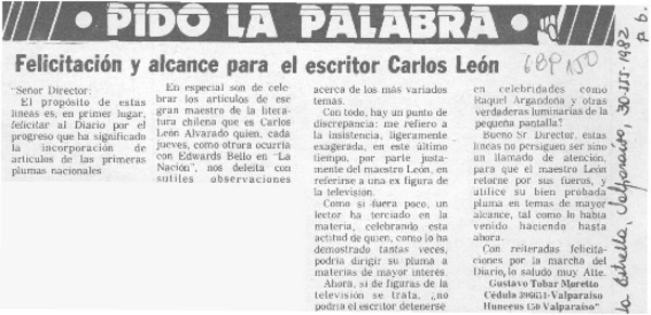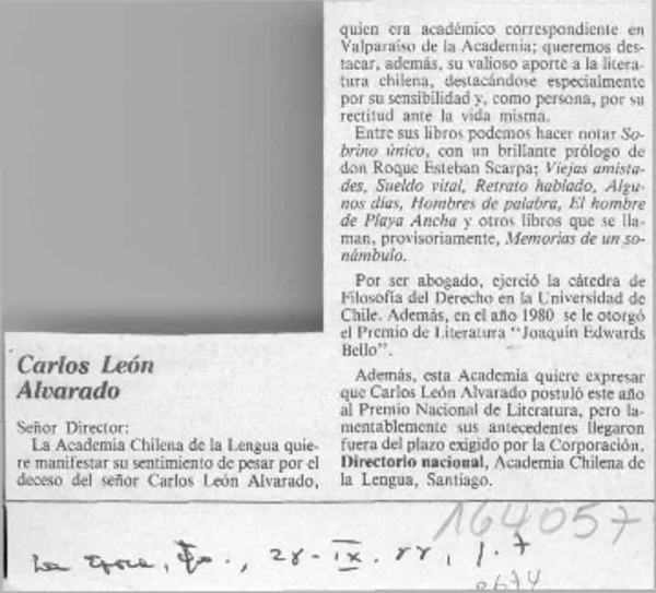 Felicitación y alcance para el escritor Carlos León [artículo] Gustavo Tobar Moretto.