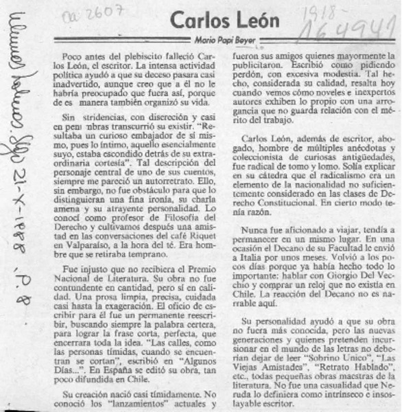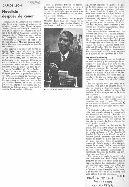 Carlos León, novelista [artículo] Ramón Riquelme.
