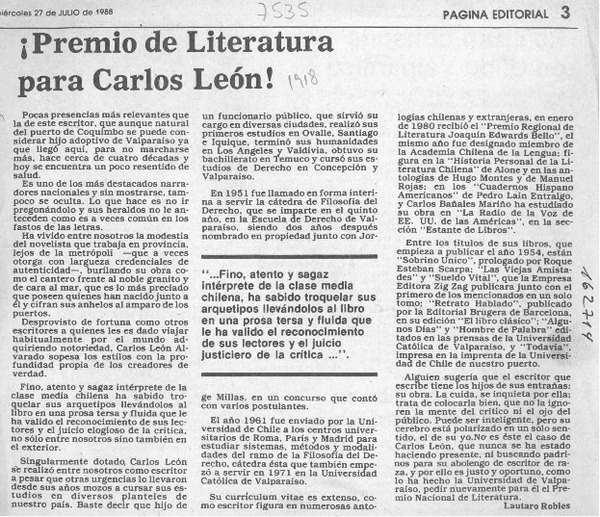 Premio de literatura para Carlos León! [artículo] Lautaro Robles.