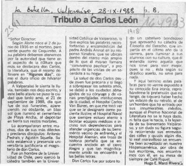 Tributo a Carlos León [artículo] Hugo E. Marzi Rivera.