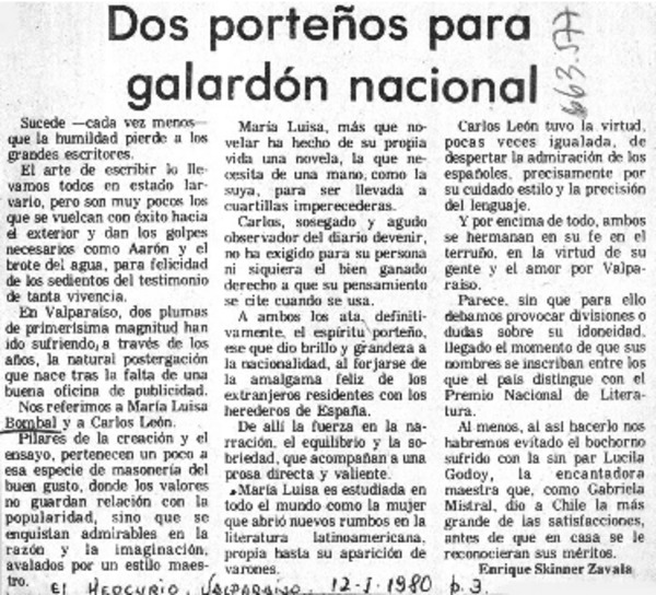 Dos porteños para galardón nacional [artículo] Enrique Skinner Zavala.