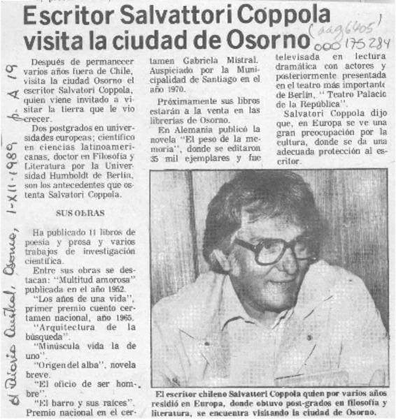 Escritor Salvattori Coppola visita la ciudad de Osorno [artículo].