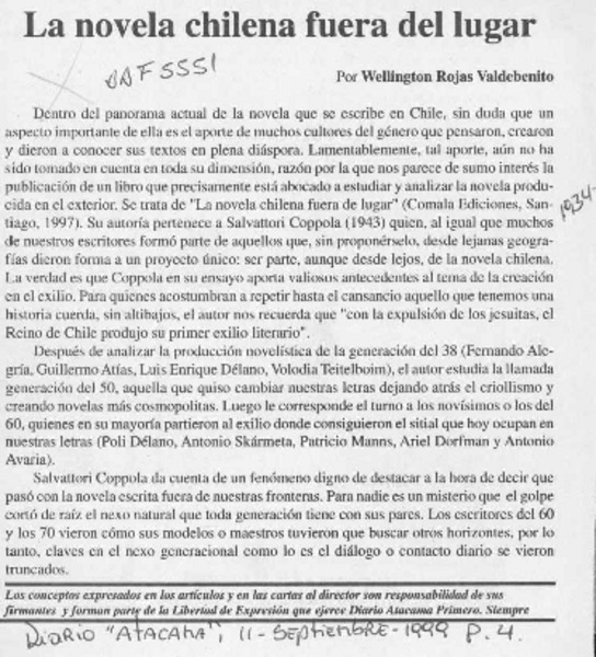La novela chilena fuera de lugar [artículo] Wellington Rojas Valdebenito.