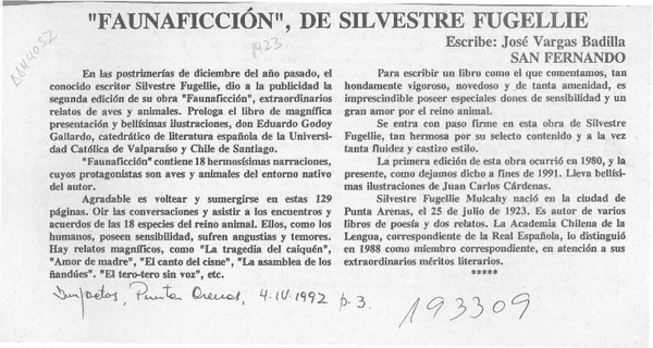 "Faunaficción", de Silvestre Fugellie [artículo] José Vargas Badilla.
