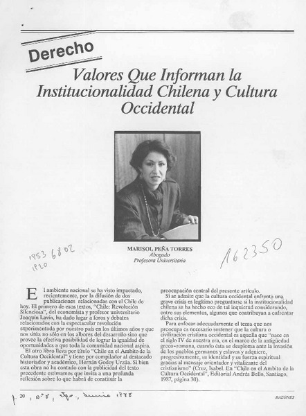 Valores que informan la institucionalidad chilena y cultura occidental [artículo] Marisol Peña Torres.