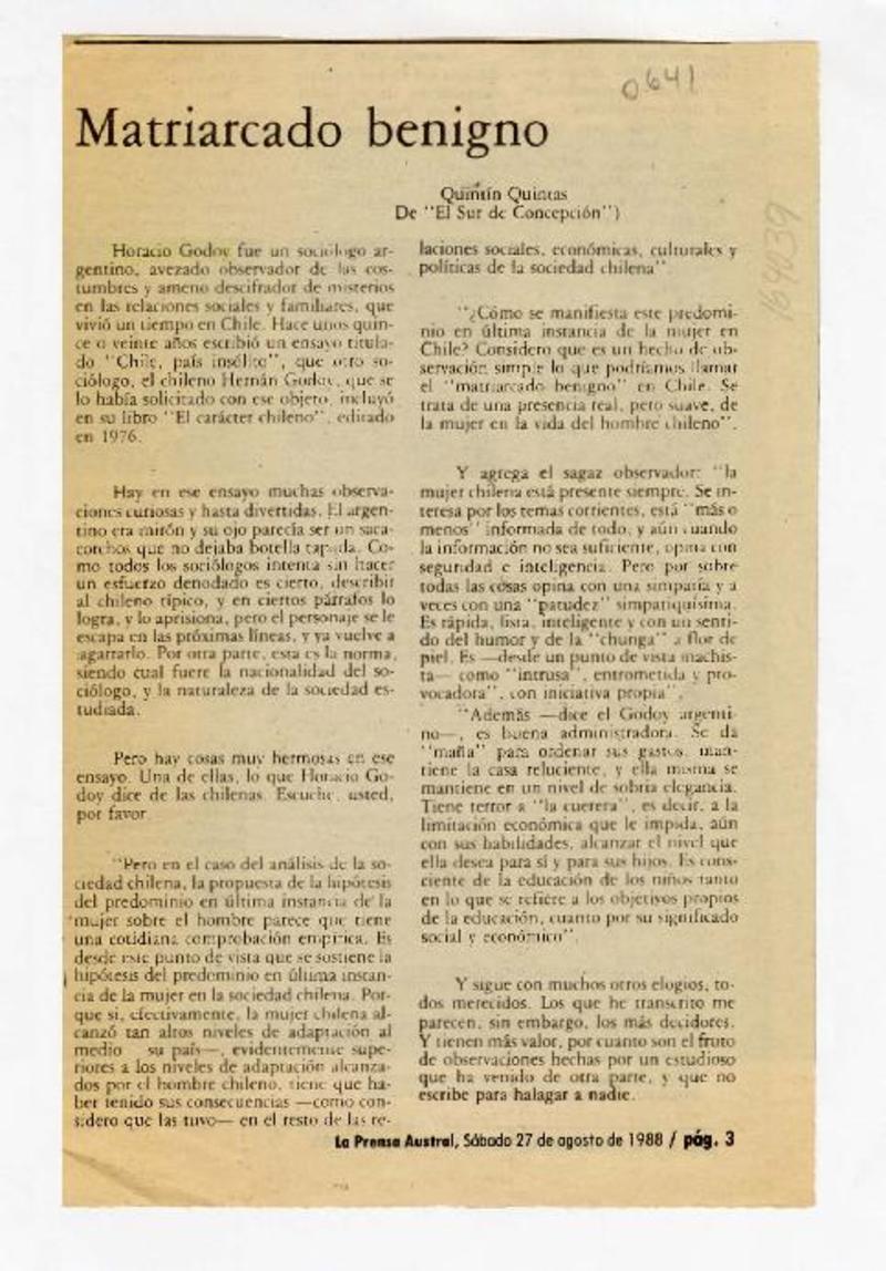 Matriarcado benigno [artículo] Quintín Quintas.
