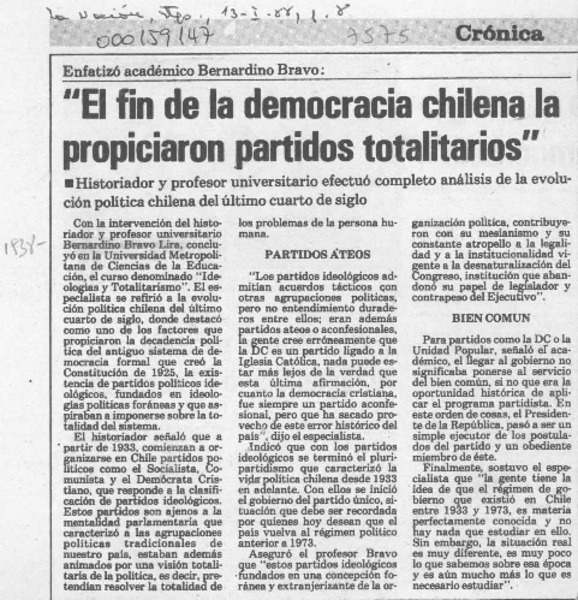 "El Fin de la democracia chilena la propiciaron partidos totalitarios" [artículo].