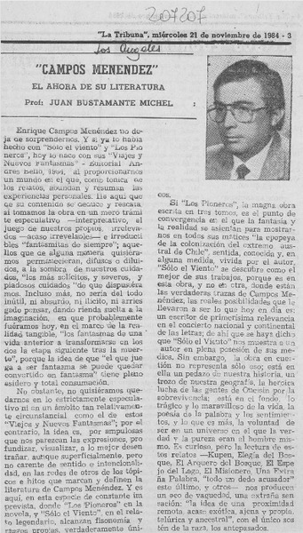 Campos Menéndez, el ahora de su literatura [artículo] Juan Bustamante Michel.