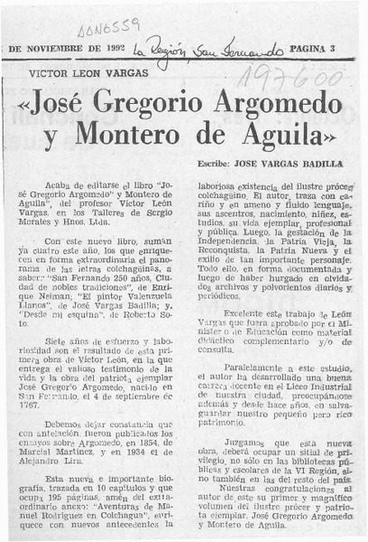 "José Gregorio Argomedo y Montero de Aguila" [artículo] José Vargas Badilla.
