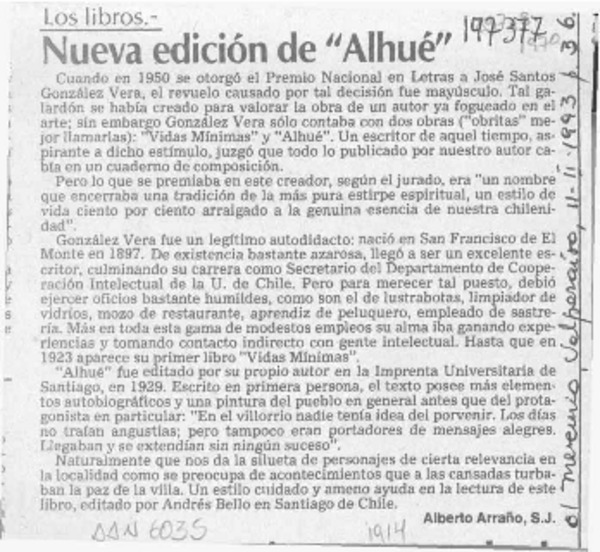 Nueva edición de "Alhué" [artículo] Alberto Arraño.