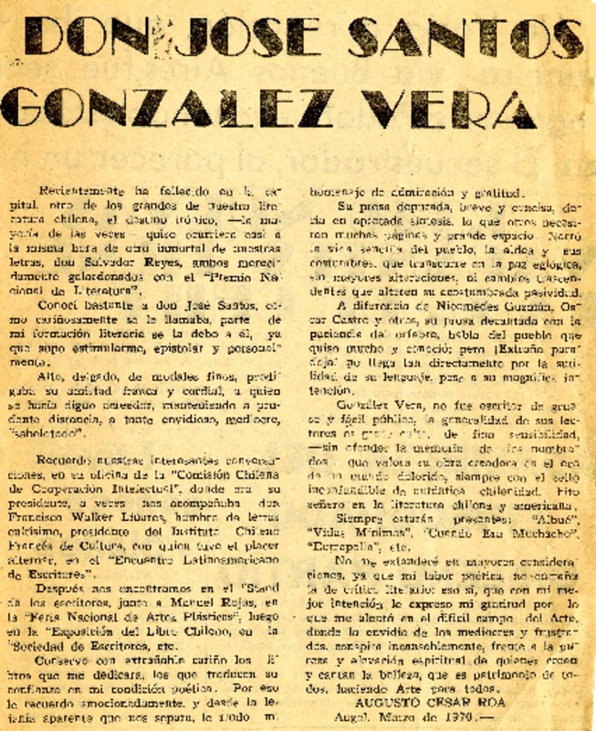 Don José Santos González Vera [artículo] Augusto César Roa.