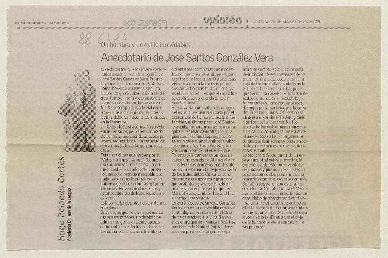 Anecdotario de José Santos González Vera [artículo] Hugo Rolando Cortés.