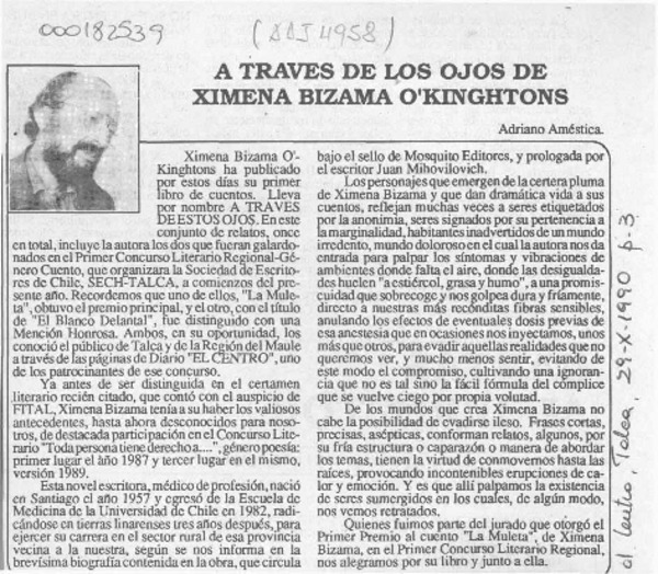 A través de los ojos de Ximena Bizama O'Kinghtons [artículo] Adriano Améstica.